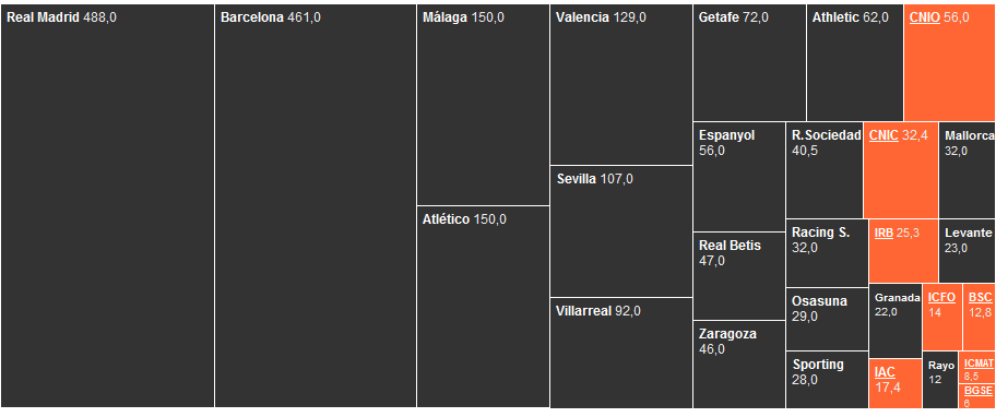 Nesta lista faltarían algunhas institucións como o Centro de Regulación Xenómica, con máis de 30 millóns de euros de orzamento é un dos mellores centros de investigación de España e a súa exclusión dos Severo Ochoa foi moi polémica. No entanto, a clasificación pode servir como exemplo dos recursos dedicados á excelencia científica fronte á excelencia futbolística.